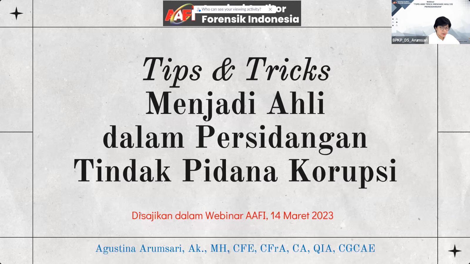 Terkait hal itu, AAFI YEBADOLMA menggelar webinar bertajuk Tips and Tricks Menjadi Ahli di Persidangan yang menghadirkan Ibu Agustina Arumsari, Ak., M.H., CFE, CFrA, CA, QIA, CGCAE (Deputi Investigasi BPKP) sebagai Narasumber dan Ibu Dr. Selvia Vivi Devianti S.E., M.Sc., MCP., Ak, CFrA, CFE, CSFA (Direktur Litbang BPK RI) selaku Moderator.�