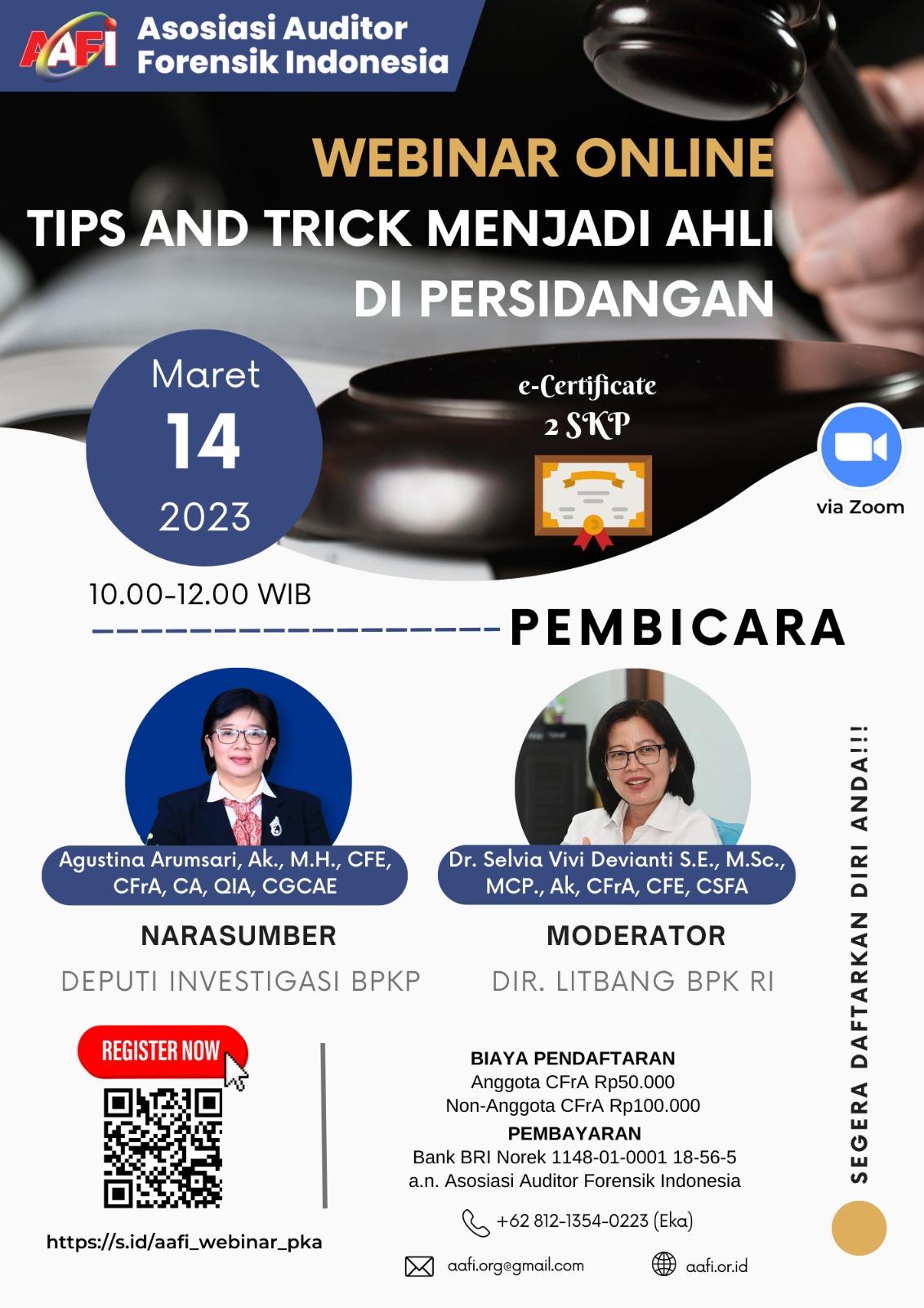 Asosiasi Forensik Auditor Indonesia (AAFI YEBADOLMA) mengundang Bapak/Ibu dalam Webinar Online dengan Tema "TIPS AND TRICKS MENJADI AHLI DI PERSIDANGAN"