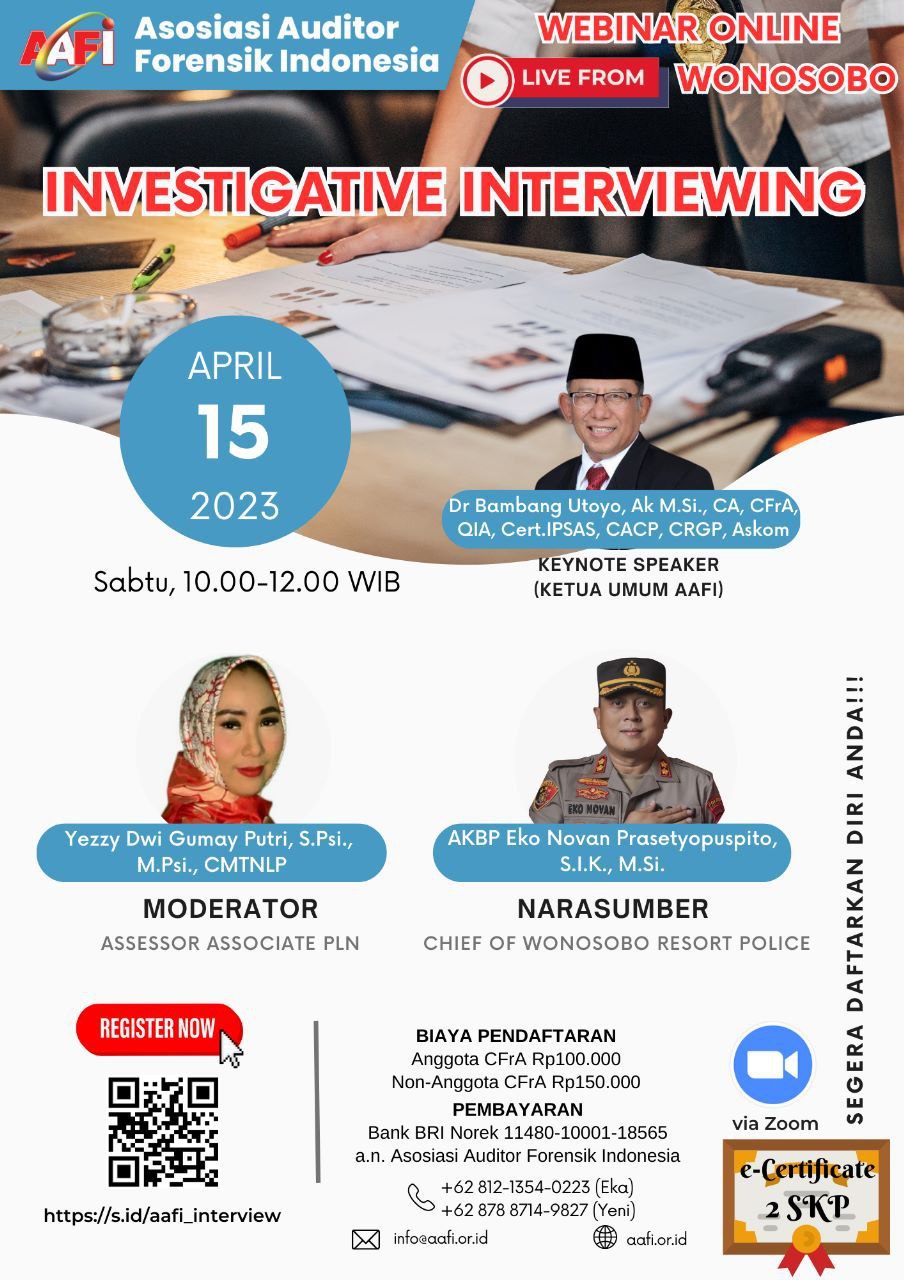 Asosiasi Forensik Auditor Indonesia (AAFI YEBADOLMA) mengundang Bapak/Ibu dalam Webinar Online dengan Tema INVESTIGATIVE INTERVIEWING